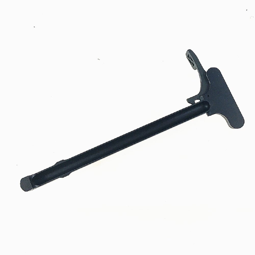 .223/5.56 charging handle allows the operator to lock the bolt open or to chamber a round with 3 different grips. This handle come with the standard finger positioning as well as an extended steel latch on the left for those who need a better purchase on the handle due to hand sizing or if the operator is wearing gloves. Also attached with this latch is the ambidextrous right side lever allowing any kind of grip on the handle to pull and set back the bolt.