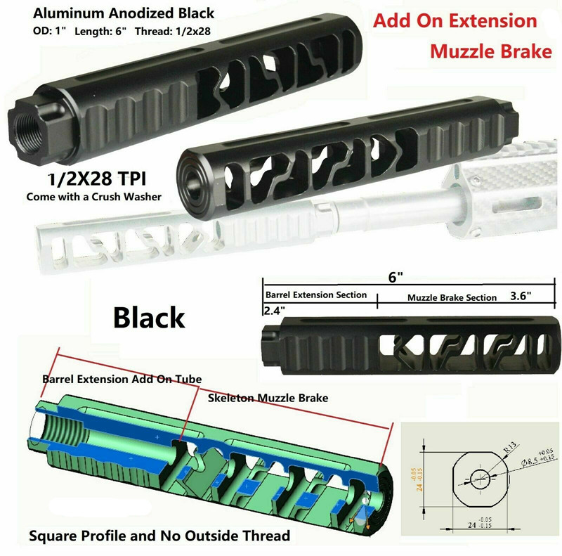 DB TAC Aluminum 1/2”x28 TPI Thread For 9mm Caliber, Square Profile 3.6″ Short Muzzle Brake With 2.4″ Extension No Outside Thread