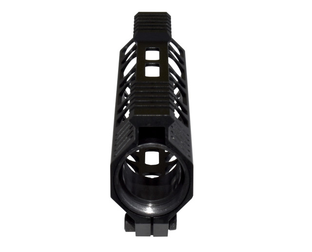 A true free float rail, which connects only at the barrel nut. Since the rail doesn’t touch the barrel, shooting accuracy is improved in comparison with two piece rails, when used with grips / bipods that can flex the Steel barrel.