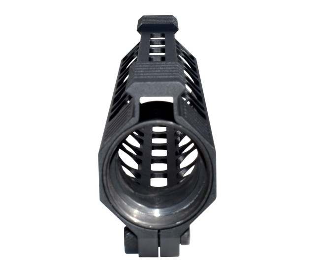 A true free float rail, which connects only at the barrel nut. Since the rail doesn’t touch the barrel, shooting accuracy is improved in comparison with two piece rails, when used with grips / bipods that can flex the Steel barrel.