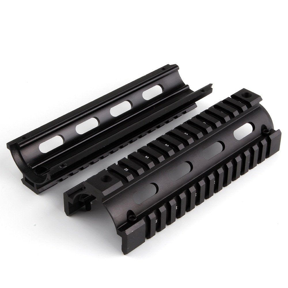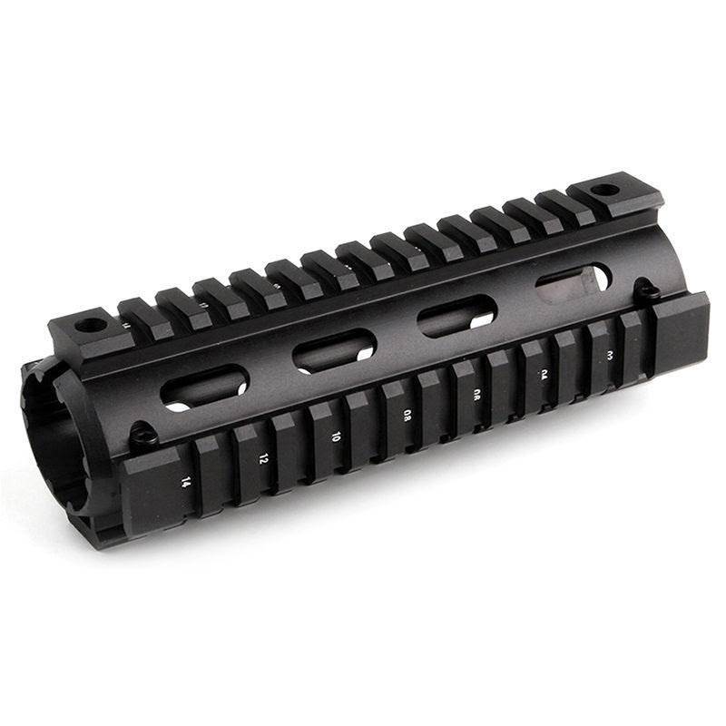 Product Features:* Carbine Length Quad Rail to replace factory 6.7 inch Carbine Length handguards.* Top rail is at receiver height and the quad rails are Picatinny/ MIL STD 1913 specs. Large ventilation holes.* Fits onto Carbine Length rifles using the GI Handguard Cap and Delta Ring. Works with both the circular style handguard end caps. Not compatible with triangular style end caps.* The Solid Quad Rail allows for the attachment of: lights, lasers, designators, vertical grips, bipods and other accessories that can mount onto weaver/Picatinny/ MIL STD 1913 type rails.* Very easy to install with four Allen head screws and the provided mounting tool. No gunsmithing required, drop-in fit.