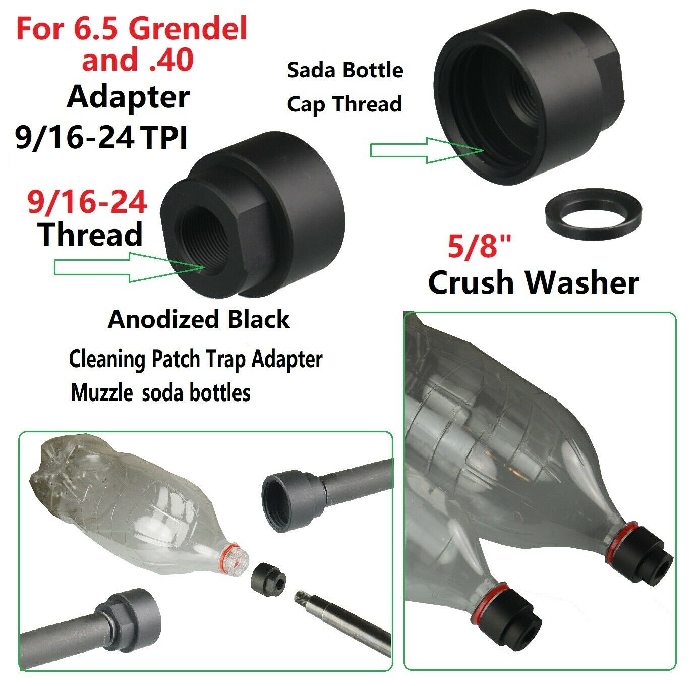 6.5 Grendel and .40 Cleaning Patch Trap Adapter Muzzle Soda Pop bottles