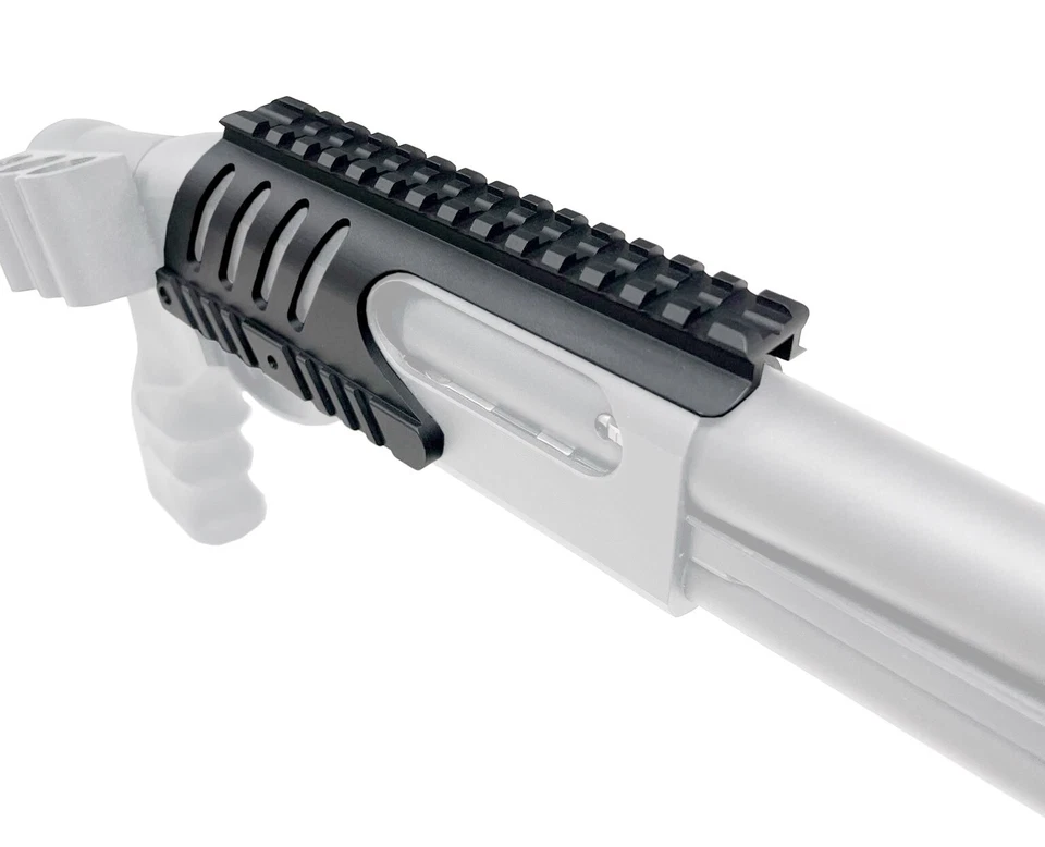Upgrade your shotgun with this rugged, eye-catching black anodized aluminum forend and full-length receiver rail — designed for serious slug shooting, turkey hunting, tactical work, and home defense. Machined from high-strength aluminum and finished with a durable black hard-anodize, this forend provides exceptional grip and long-term durability.