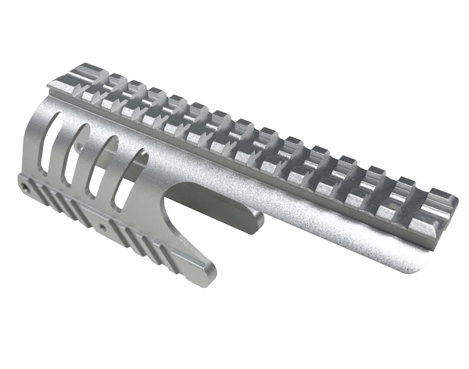 Upgrade your shotgun with this rugged, eye-catching Silver anodized aluminum forend and full-length receiver rail — designed for serious slug shooting, turkey hunting, tactical work, and home defense. Machined from high-strength aluminum and finished with a durable Silver hard-anodize, this forend provides exceptional grip and long-term durability.