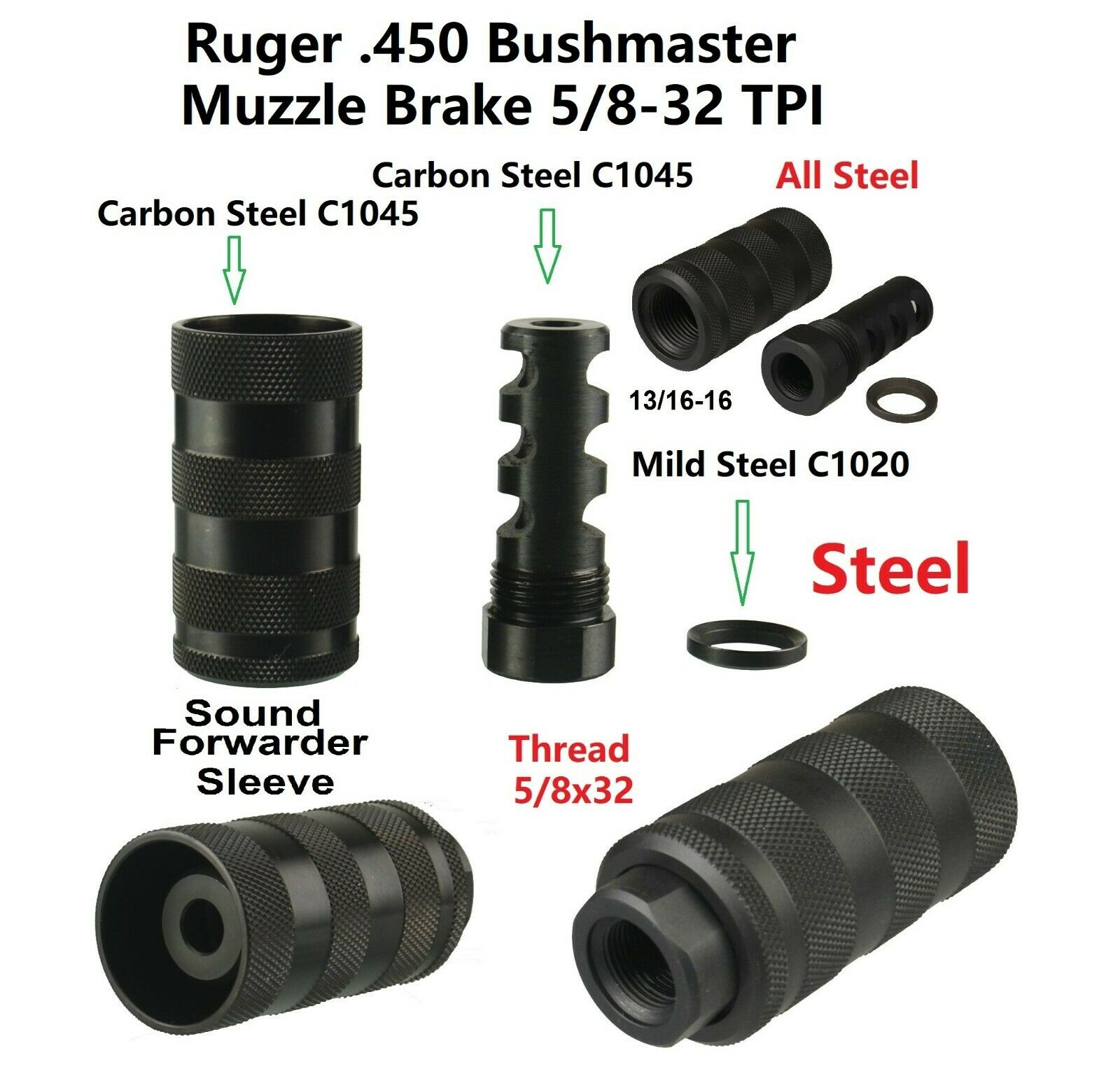 DB TAC All Steel .450 Bushmaster Muzzle Brake 5/8”x32 TPI Thread With Sound Forwarder 13/16”x16 TPI Thread