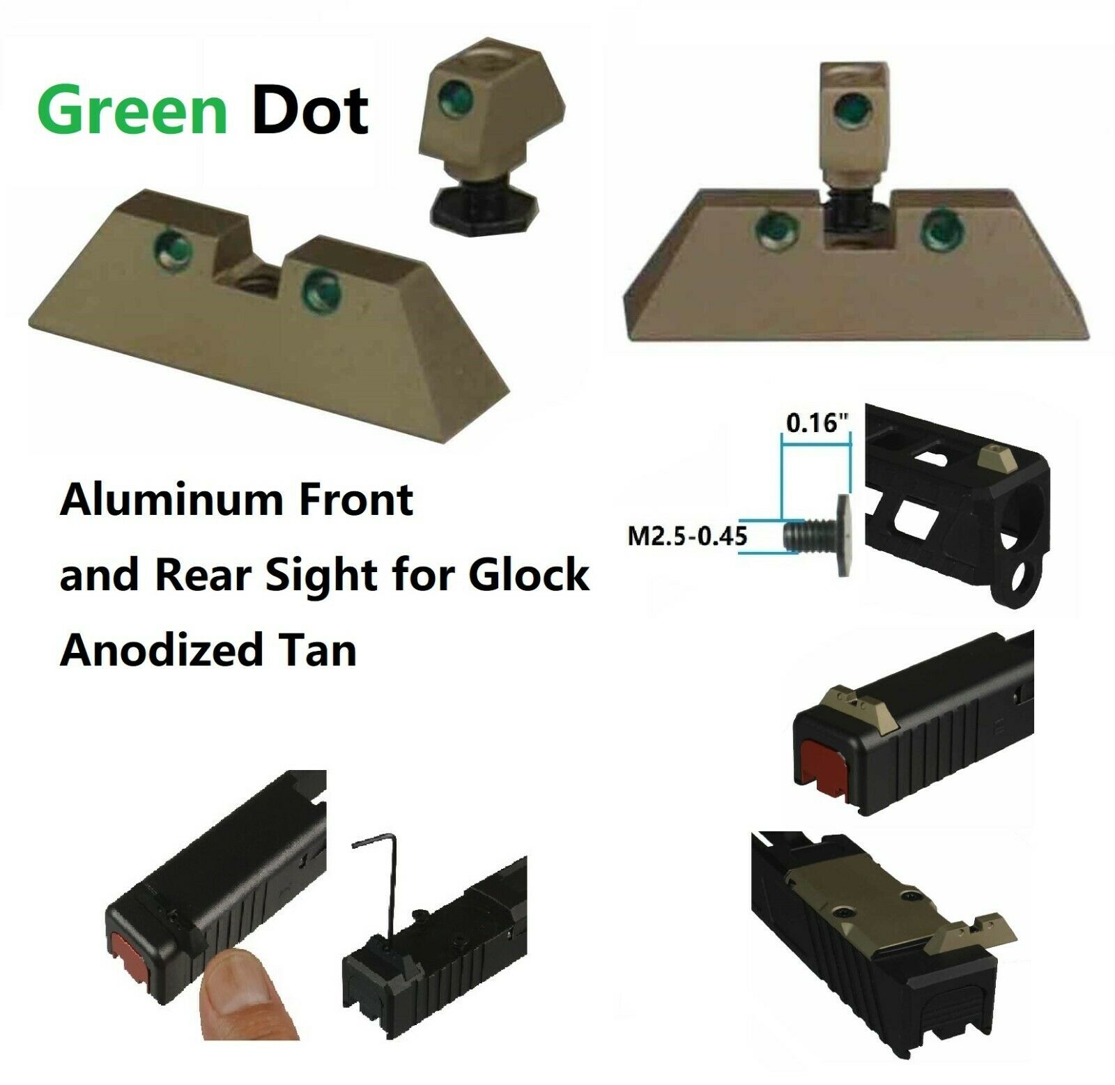 DB TAC Aluminum Tan Front and Rear Sight 6.5 mm Green Dot for GLOCK 17, 19, 22, 23, 24, 26, 27, 31, 34, 35