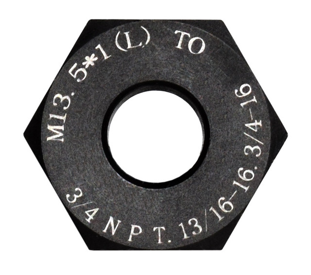 Converts M13.5×1 LH external thread to multiple internal thread options:- 3/4 NPT