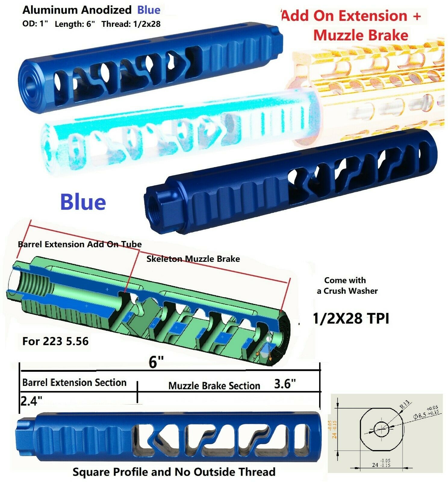 DB TAC 1/2”x28 TPI Thread For .22LR/.223/5.56 Caliber Square Profile 3.6″ Muzzle Brake With 2.4″ Extension No Outside Thread Blue Color Aluminum 7075 T6