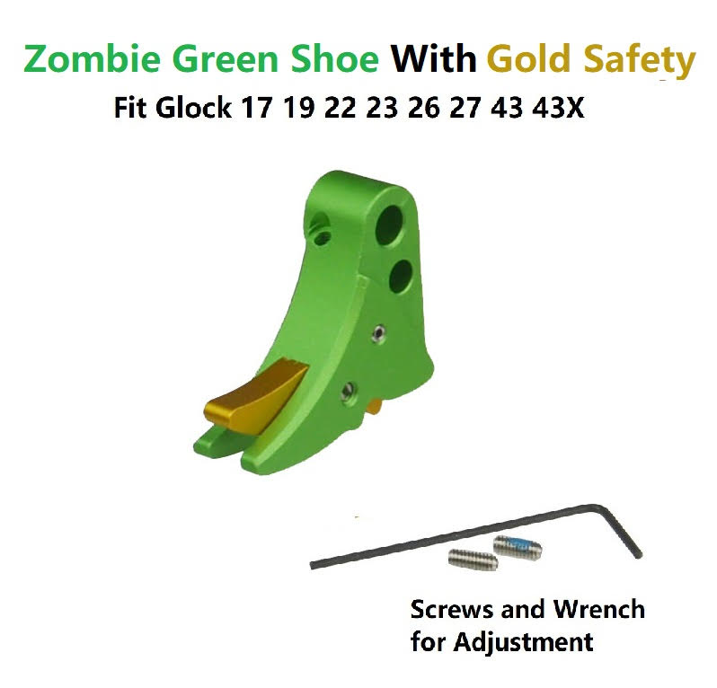 DB TAC Green Color Trigger Shoe With Gold Color Safety For All Glock GEN 3-4 & GEN 5 models, from sub-compacts to large frames