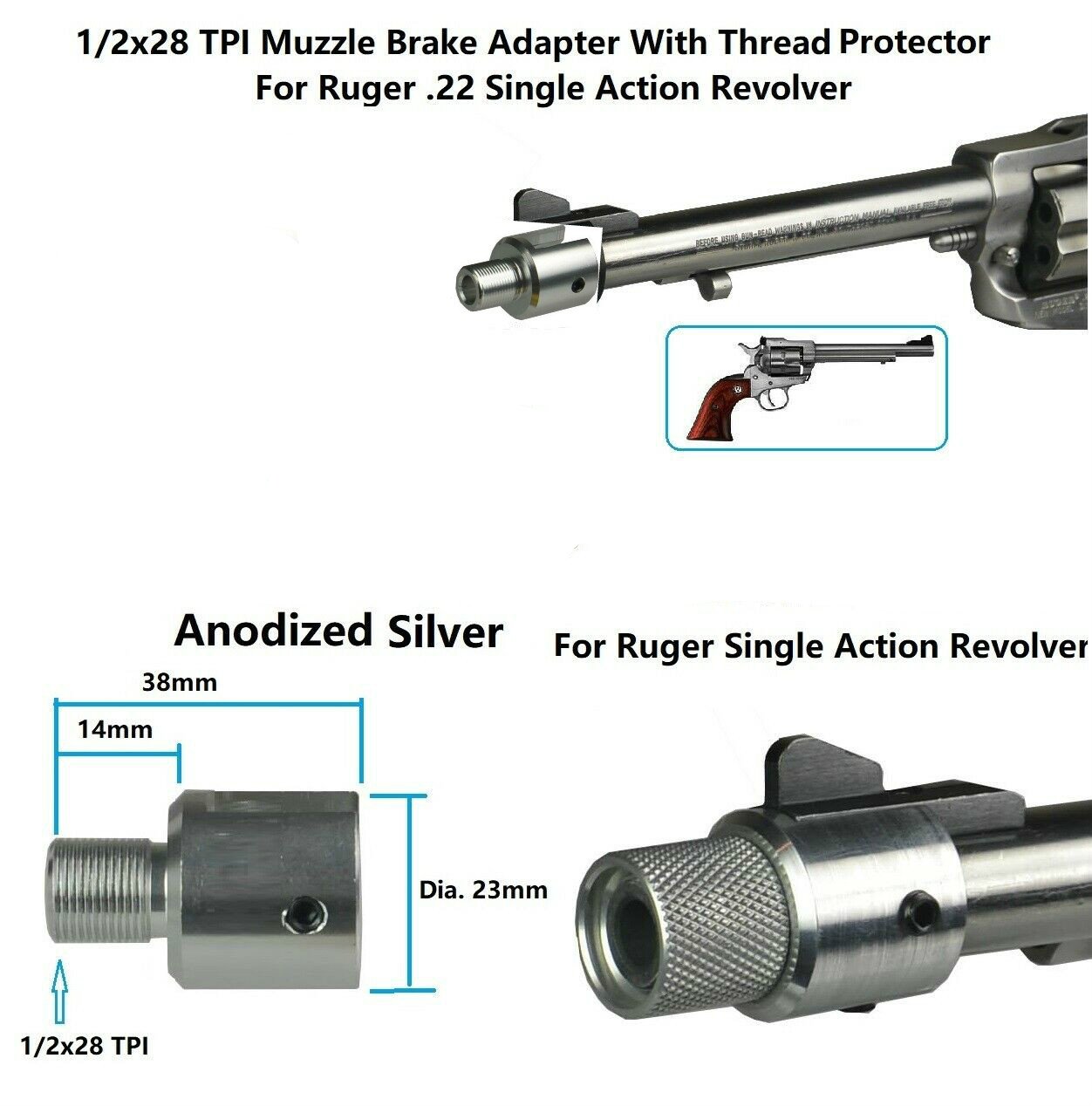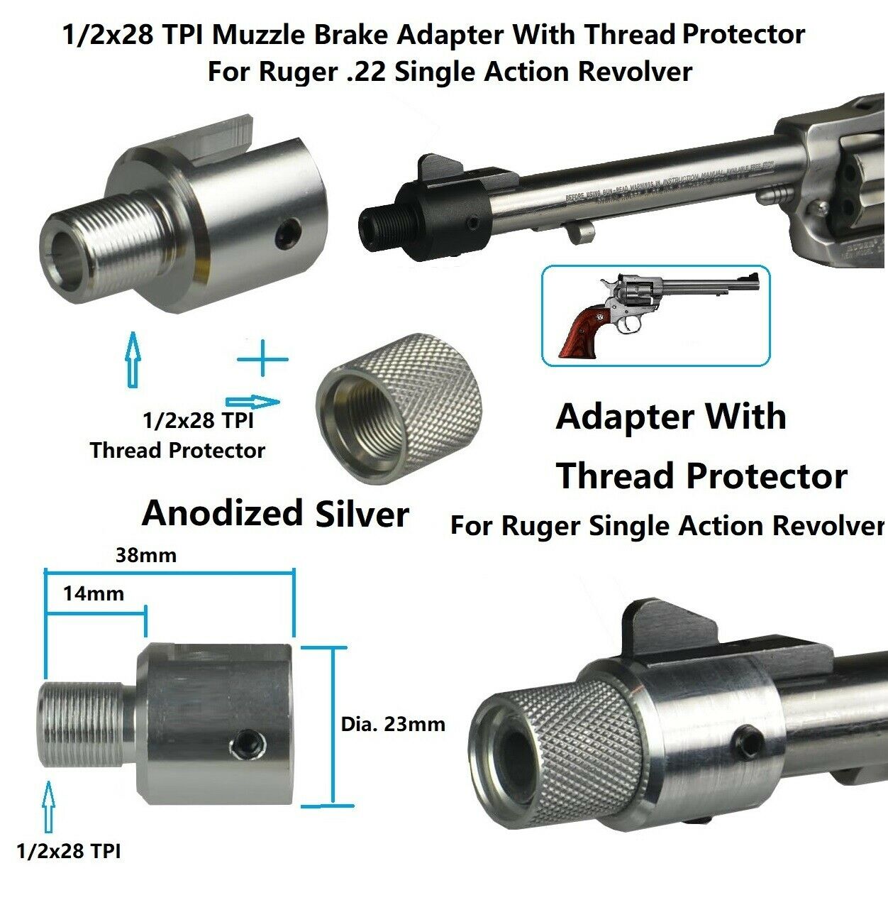 DB TAC 1/2×28 TPI Thread Muzzle Adapter With Thread Protector For Ruger .22 Single Action Revolver Silver Color