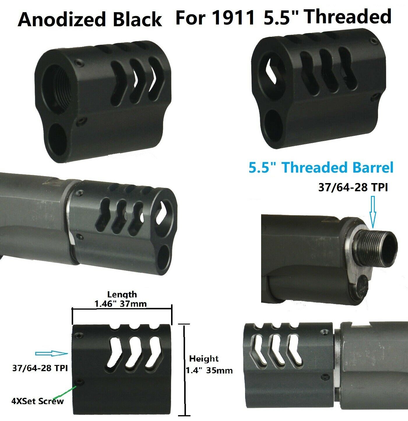 - Muzzle Brake For 1911 .45 ACP , For 5.5″ Threaded 37/64-28 TPI Barrel,Black