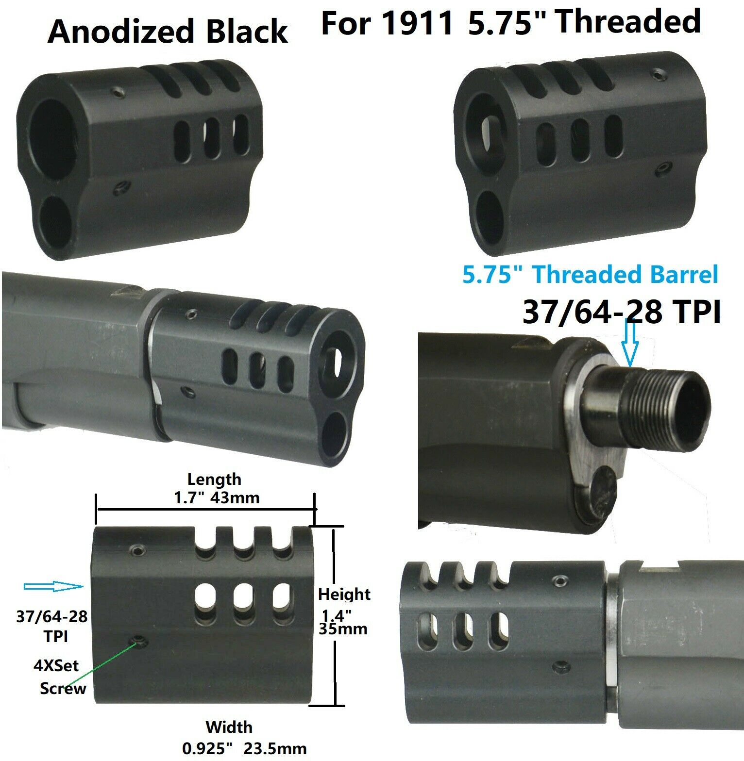DB TAC 1911 .45 ACP Muzzle Brake Compensator 37/64×28 TPI Thread Black w/ Set Screws