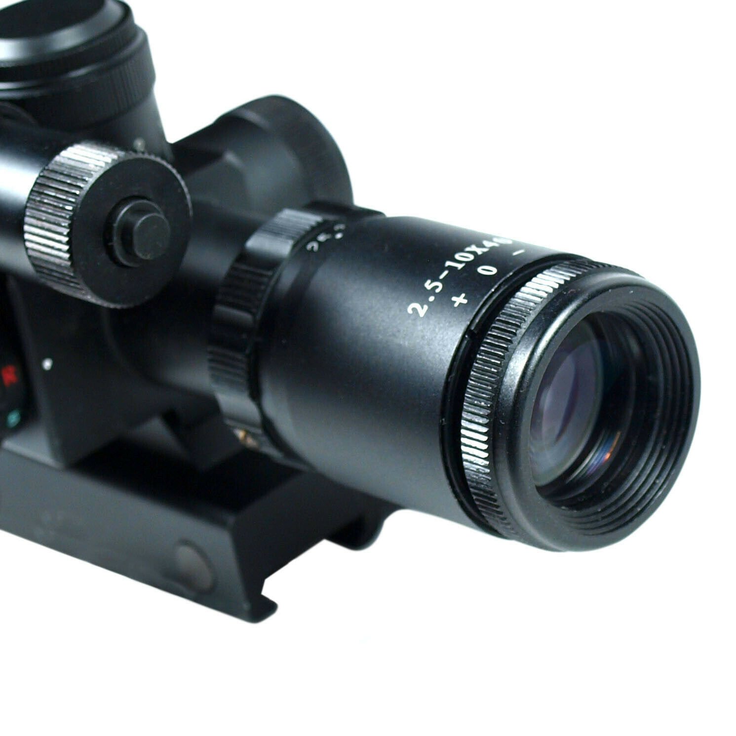 This compact tactical rifle scope is well suited for close to mid range shooting, with high optical clarity at 2.5-10X times magnification and a 40mm objective diameter.