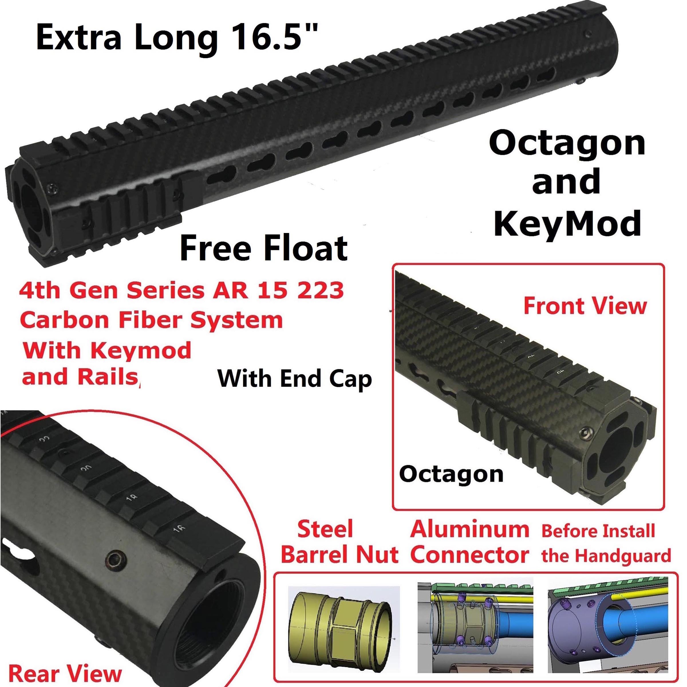 DB TAC .223/5.56 Octagon Carbon Fiber 16.5 Inch Free Float KeyMod Handguard Light Weight Picatinny/Weaver Rail