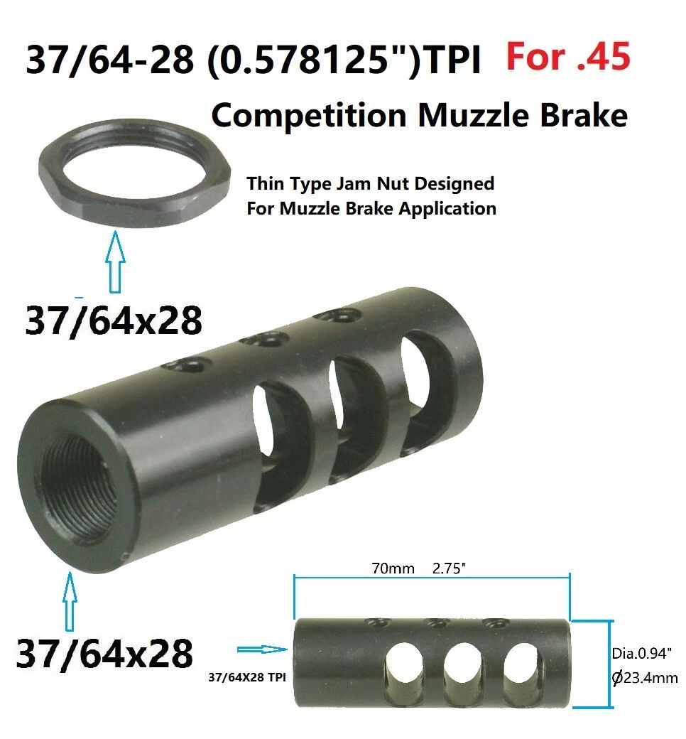 DB TAC Steel .45 .40 Caliber Long Competition Muzzle Brake .578-28 (37/64×28) TPI Thread Steel Reduce Recoil