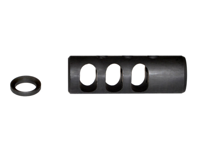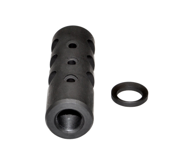 Reduce felt recoil and muzzle rise with this precision-machined steel muzzle brake / recoil compensator. CNC-machined from high-quality steel and finished in durable black, it’s built to withstand heavy use while improving follow-up shot speed and shooter comfort. The unit threads on with a standard .578-28 (37/64×28) TPI and includes a jam nut / crush washser for secure installation. Compact and lightweight at 4.1 oz, it’s optimized for .45 / .40 calibers.