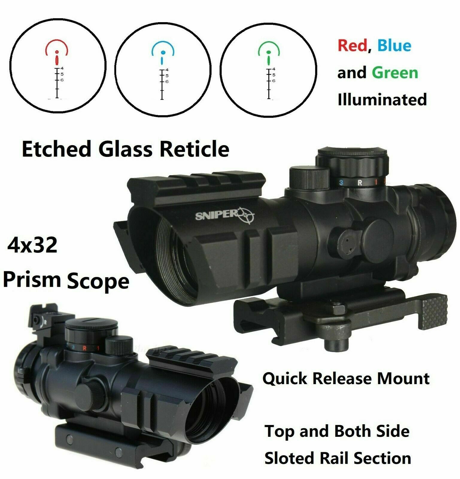 DB TAC 4X32 Len Etched Glass Compact Scope Red Blue and Green Illuminated Horseshoe Quick Detche Mount