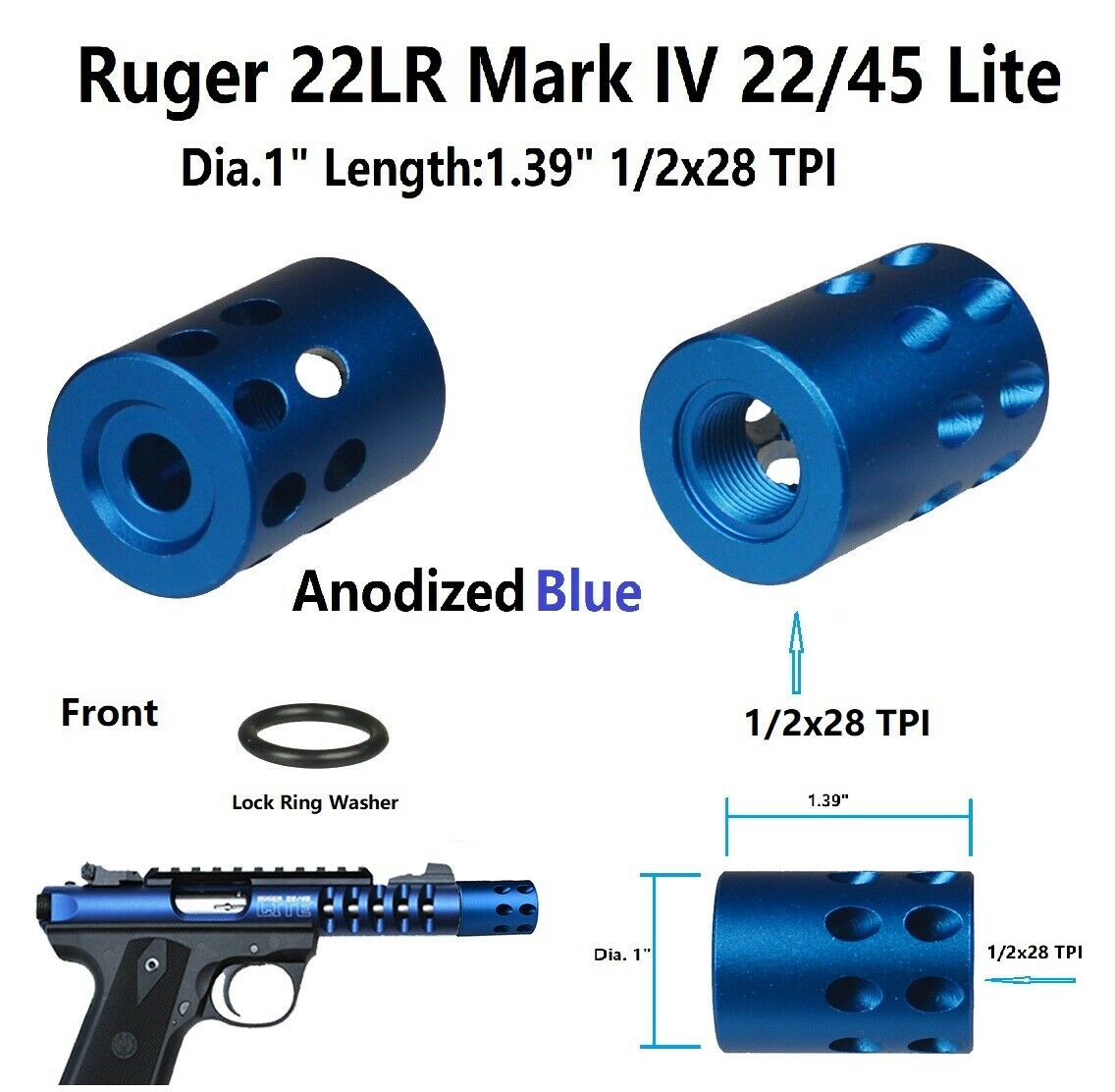 Thread: 1/2″x28 TPI – fits Ruger .22LR Mark IV / 22/45 Lite pistols