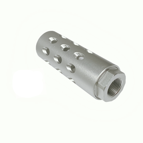 Upgrade your platform with this lightweight silver aluminum muzzle brake / compensator, designed for.22LR/.223/5.56 barrels with 1/2″x28 TPI threads. The slant forward port style helps reduce muzzle rise and improves follow-up shot speed while keeping added weight to a minimum.
