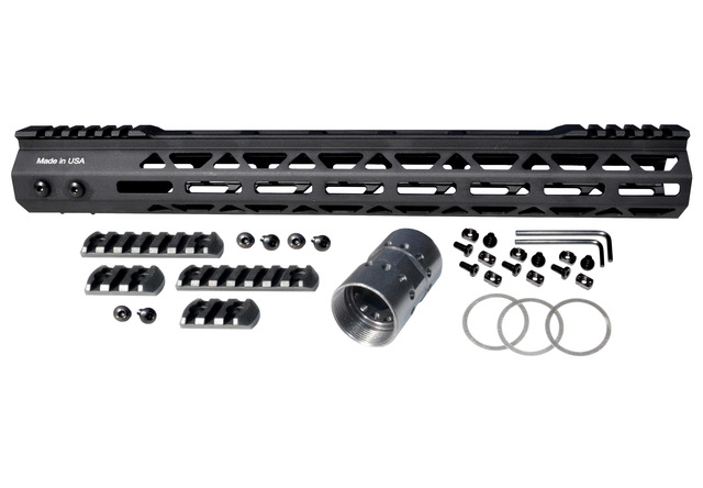 Includes steel barrel nut, screws, (2) shim rings for barrel nut timing, (2) 3 slot M-LOK rail segments, (2) 7 slot M-LOK rail segments and M-LOK screw set.