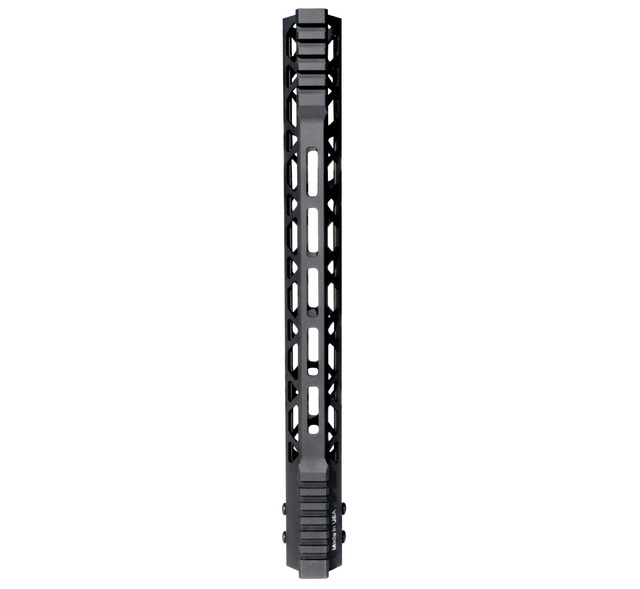 223/5.56, 15″ length free float rail mount with partial Picatinny Top rail and M-LOK slot system.