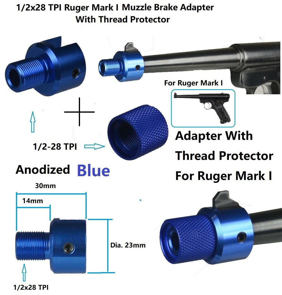 DB TAC Muzzle Brake For Ruger .22 Mark I Adapter With Thread Protector 1/2×28 TPI Thread, Blue Color