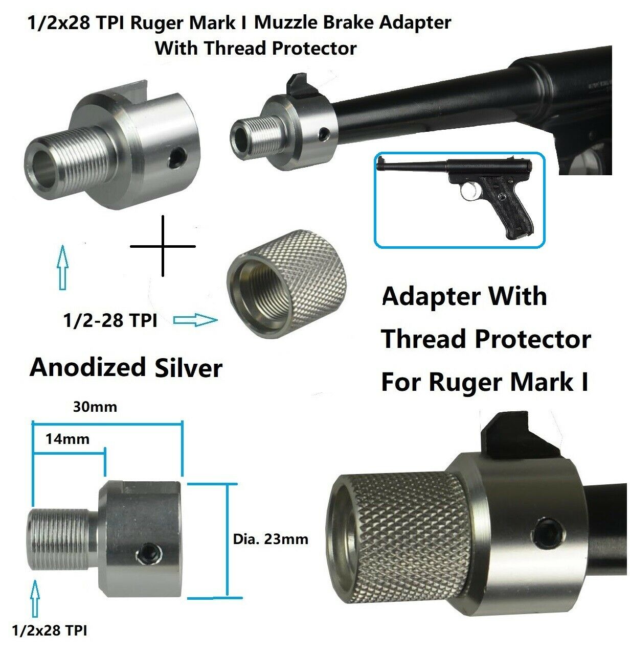DB TAC Muzzle Brake For Ruger .22 Mark I Adapter With Thread Protector 1/2×28 TPI Thread, Silver Color