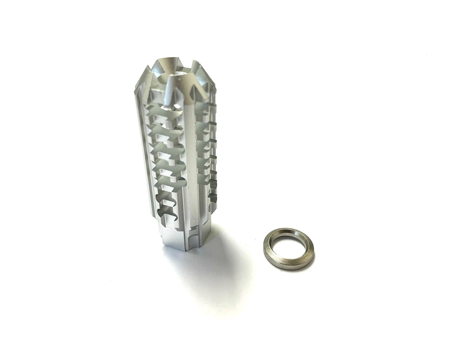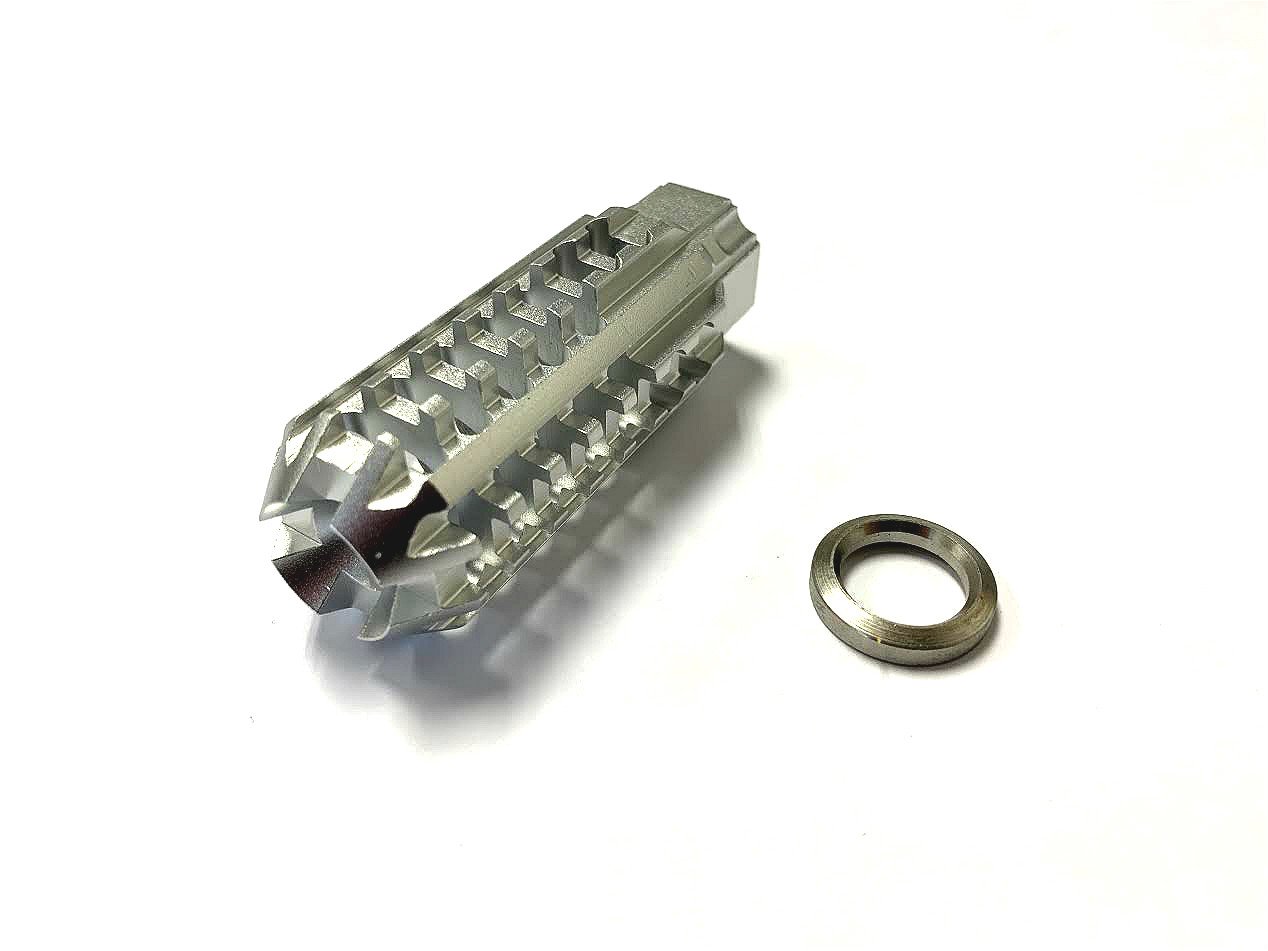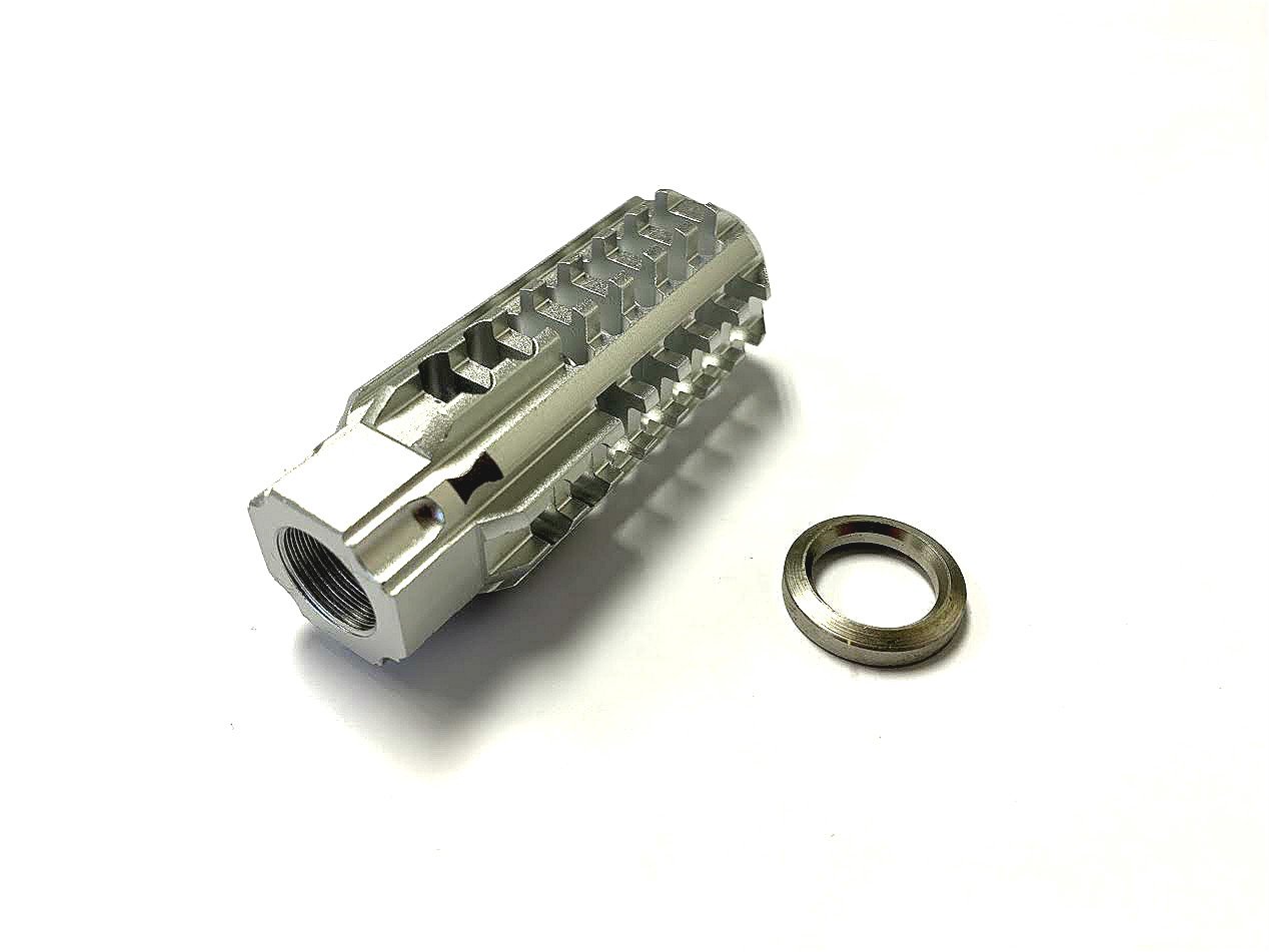 This Silver Aluminum Skeleton Muzzle Brake Compensator from DB TAC is designed to add a striking custom look while helping manage recoil on lightweight firearm builds.