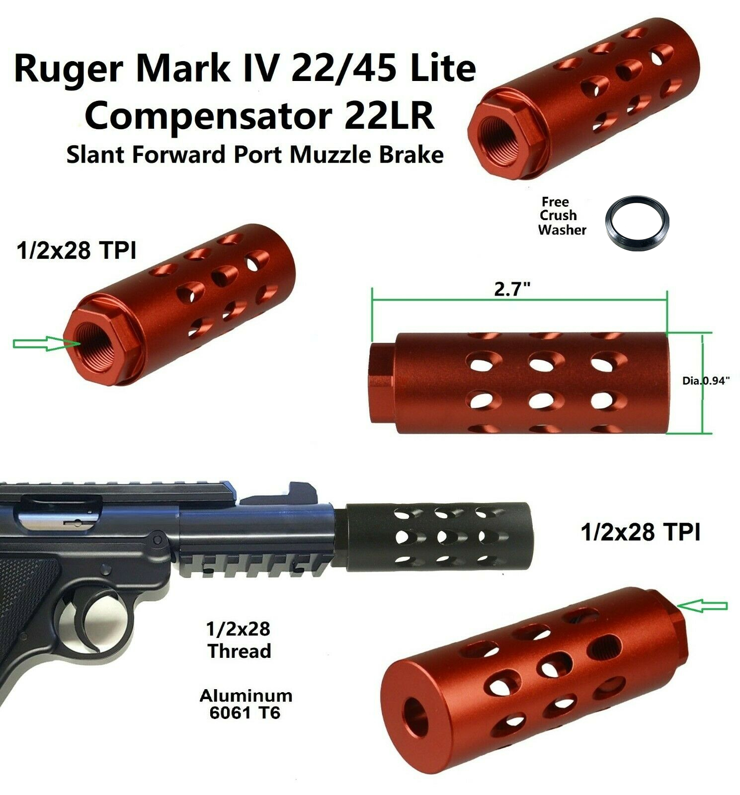 Upgrade your platform with this lightweight Red aluminum muzzle brake / compensator, designed for Ruger Mark IV 22/45 Lite .22 barrels with 1/2″x28 TPI threads. The slant forward port style helps reduce muzzle rise and improves follow-up shot speed while keeping added weight to a minimum.