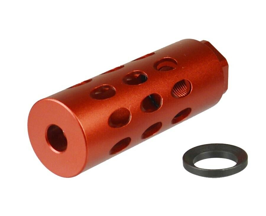 Crafted from high-quality aluminum with a durable Red finish, this compensator measures 69 mm in length and weighs only 2.3 oz, making it an excellent choice for lightweight builds and competition use. Thread-on installation makes fitting simple — please confirm your barrel thread spec (1/2″x28 TPI) before ordering.