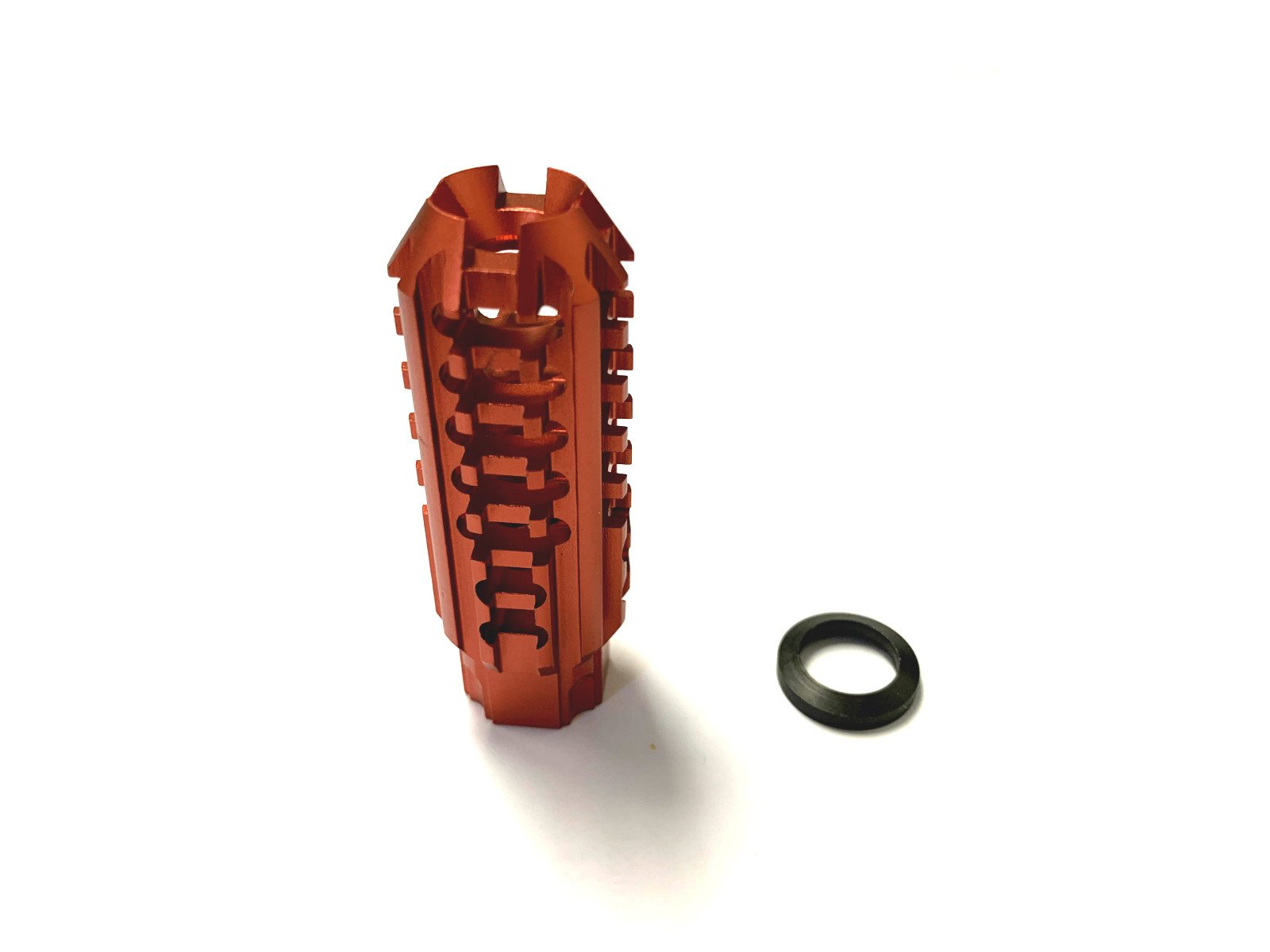 This Red Aluminum Skeleton Muzzle Brake Compensator from DB TAC is designed to add a striking custom look while helping manage recoil on lightweight firearm builds.