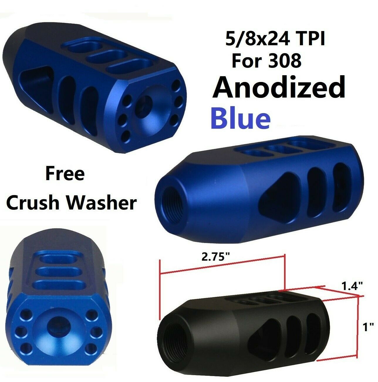 DB TAC Low Concussion Muzzle Brake Compensator 2.75″ Tanker Style 5/8”x24 TPI Thread For .308 Blue Color