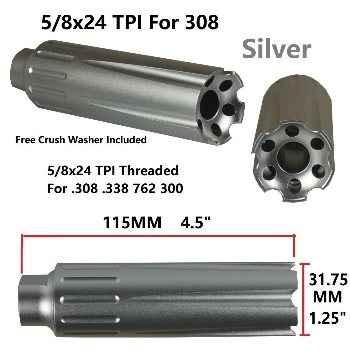This long, precision-machined compensator is built for .308 / .338 / 300Blackout / 350Legend / 9mm platforms with 5/8”x24 barrels. At 4.5 inches overall length, it offers enhanced recoil control and muzzle-rise reduction while maintaining a low-concussion profile. Machined from lightweight aluminum and finished with a silver hardcoat anodized surface, it combines durable corrosion resistance with a tactical, low-glare appearance — ideal for competition, precision, and custom builds.