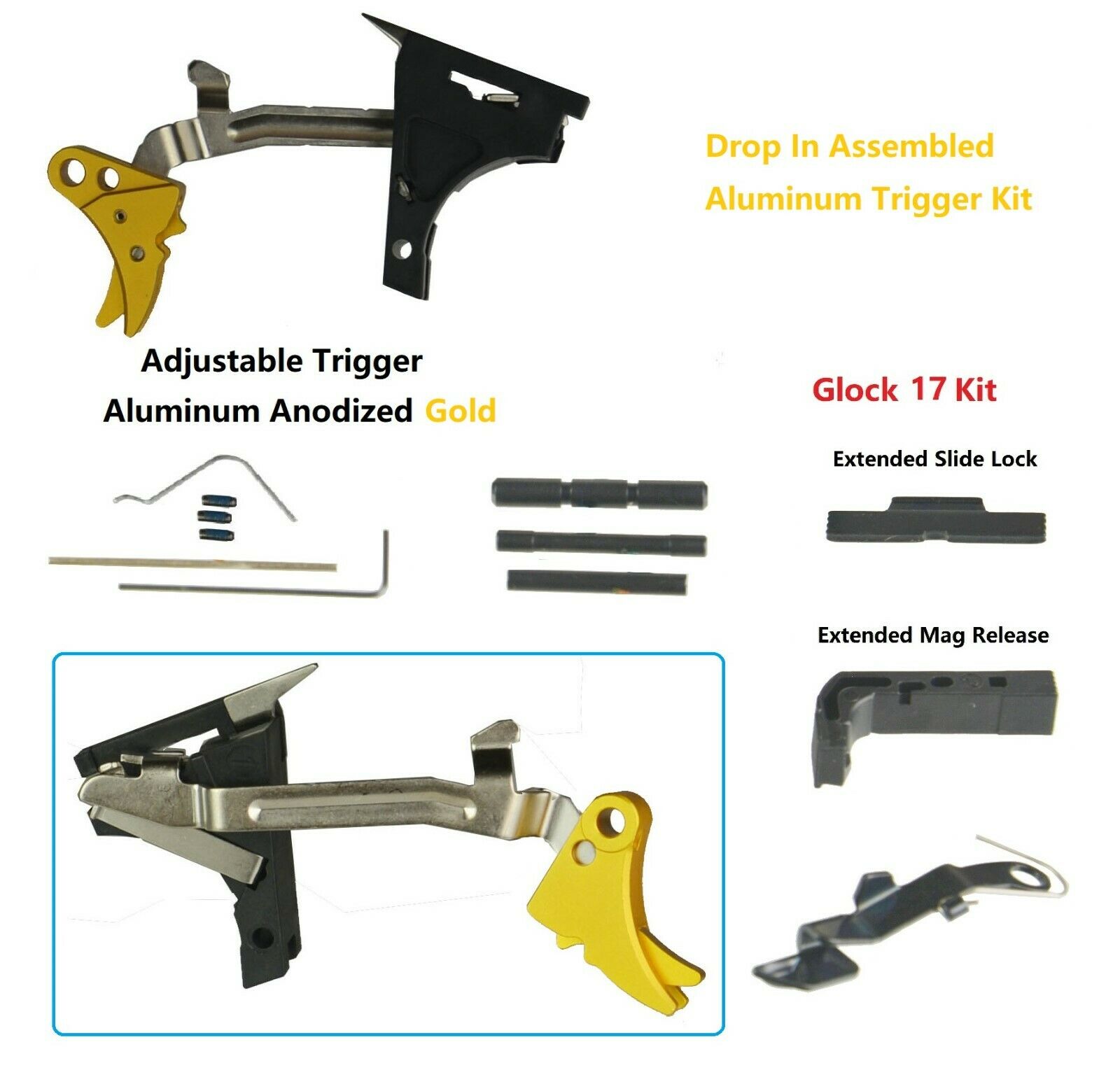 DB TAC Lower Parts Kit for GLOCK 17, Gen 1-3, and P80 With Adjustable Gold Trigger, Extended Release and Slide Lock