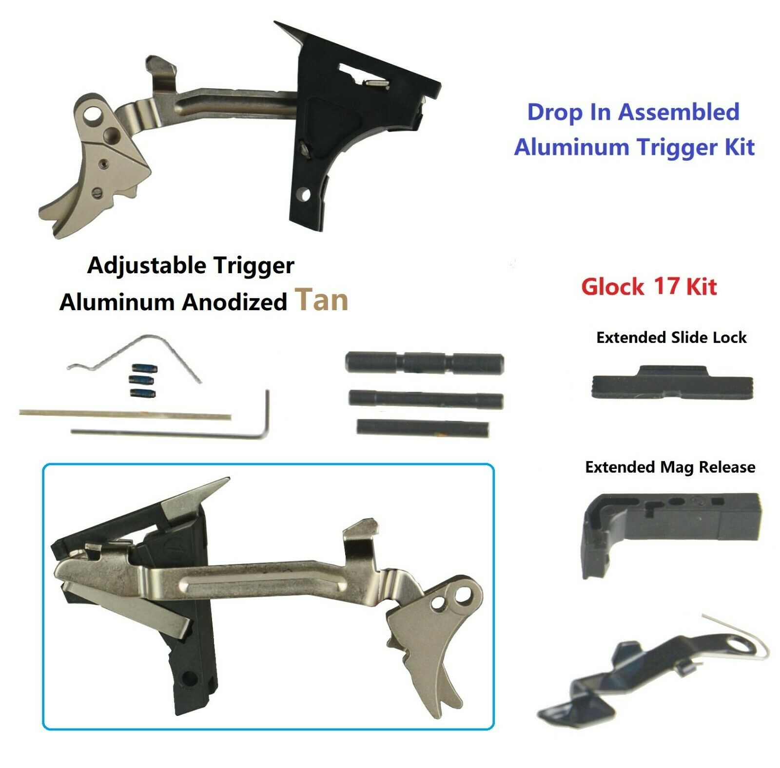 DB TAC Lower Parts Kit for GLOCK 17, Gen 1-3, and P80 With Adjustable Tan Trigger, Extended Release and Slide Lock