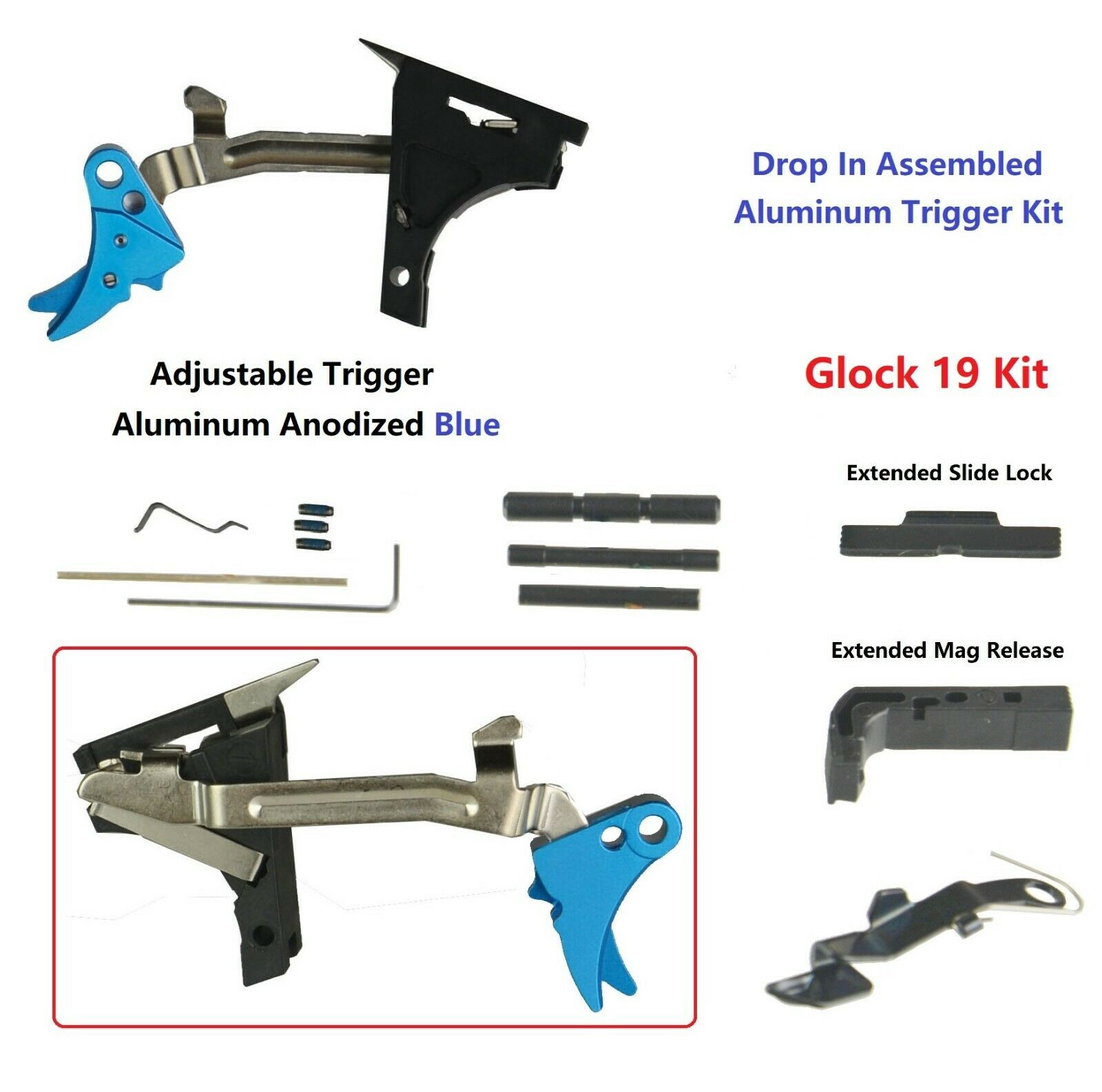 DB TAC Lower Parts Kit For GLOCK 19 Gen 1-3 9mm, Anodized Blue Aluminum Adjustable Trigger Polymer 80 Extended Release