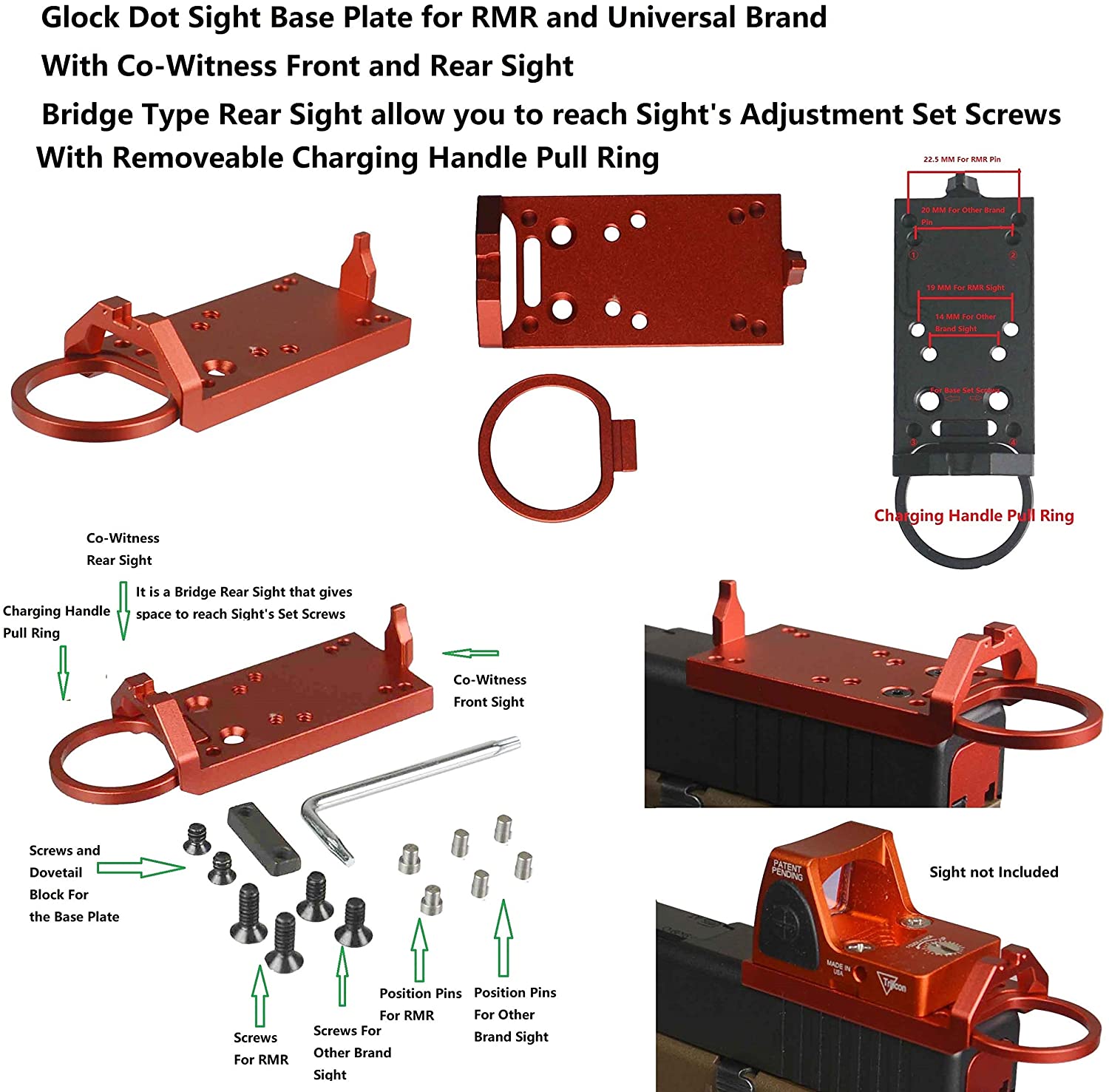 DB TAC Multifunction Platform Plate Base Mount for Dot Sight Fits GLOCK With Co-Witness Front Rear Sight and Removable Charging Pull Ring, Anodized Red Color