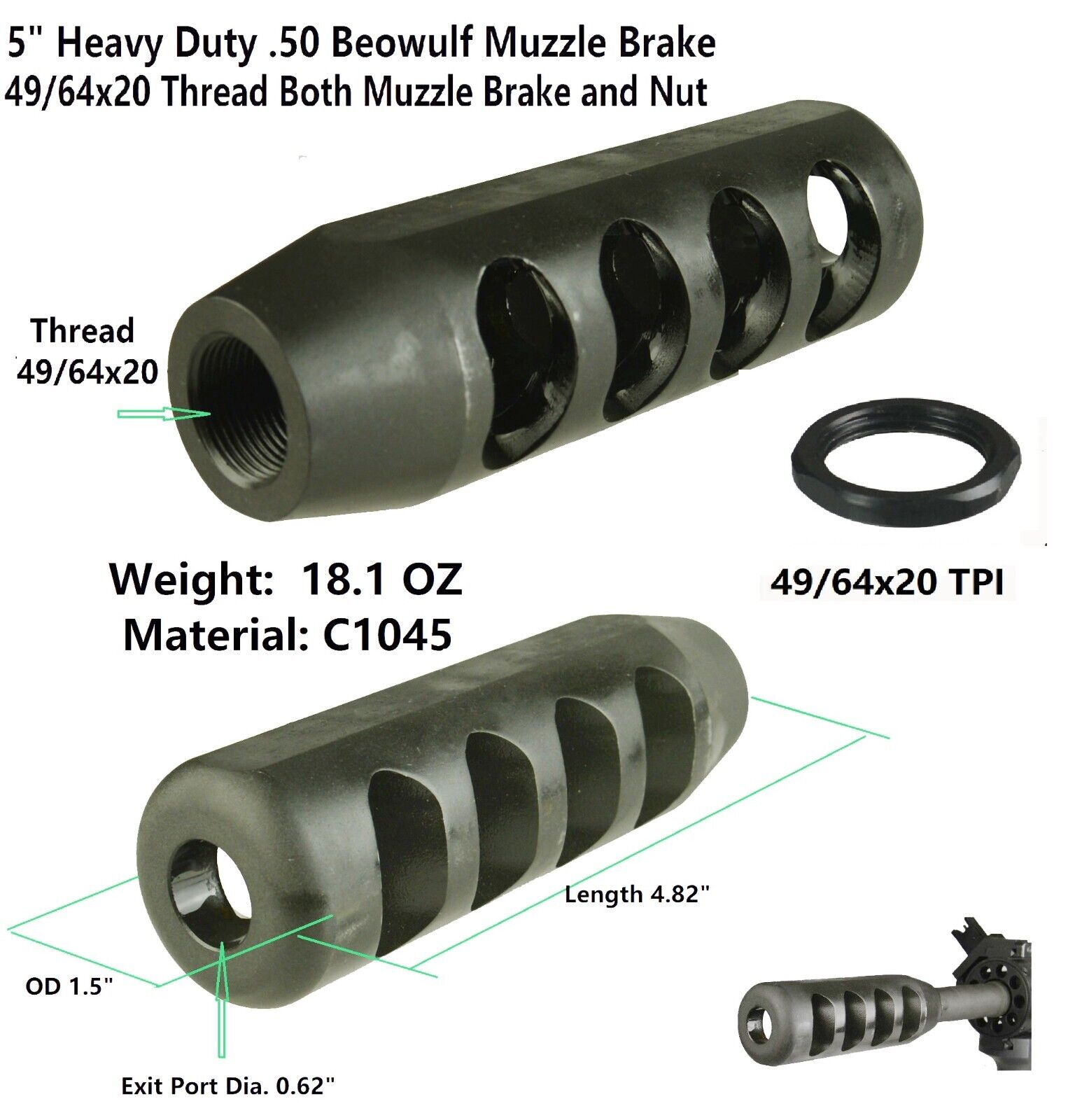DB TAC Steel Heavy Duty 49/64”x20 TPI Thread Muzzle Brake For .50BEO