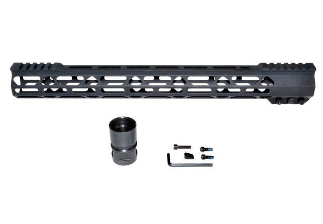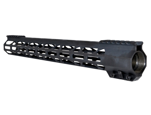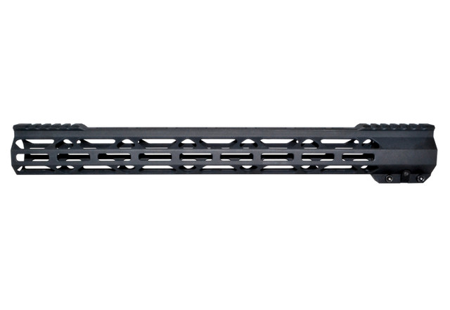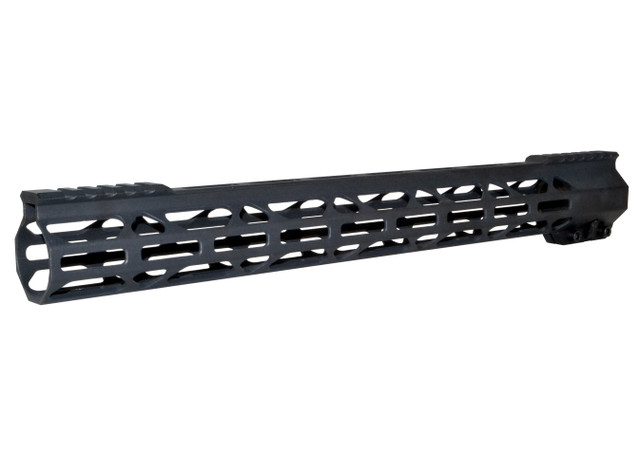 AR-15 .223/5.56, 15″ length free float rail mount with partial Picatinny Top rail and M-LOK slot system. Steel barrel nut included. CNC machined from Quality aluminum and black anodized. Super light weight, only 13oz with barrel nut.