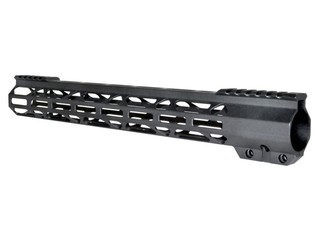 AR-15 223/5.56, 17″ length free float rail mount with partial Picatinny Top rail and M-LOK slot system. Steel barrel nut included. CNC machined from Quality aluminum and black anodized. Super light weight, only 11.8oz with barrel nut.