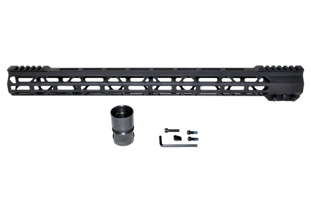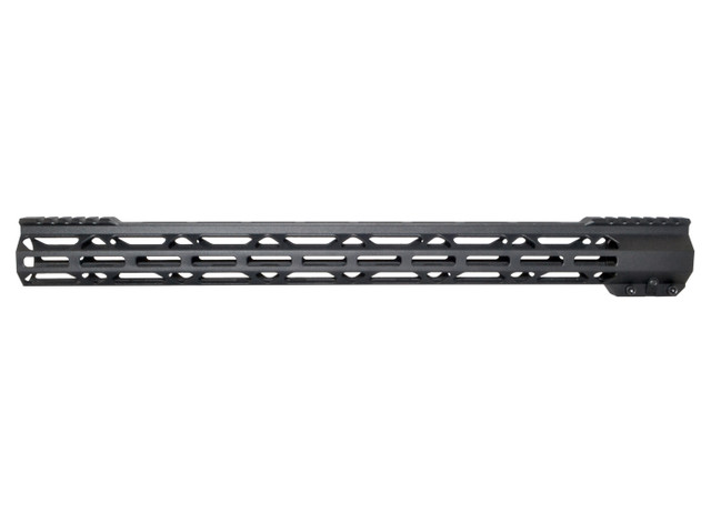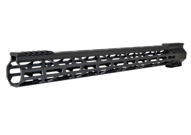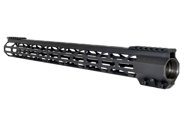 AR-15 .223/5.56, 15″ length free float rail mount with partial Picatinny Top rail and M-LOK slot system. Steel barrel nut included. CNC machined from Quality aluminum and black anodized. Super light weight, only 14.1oz with barrel nut.