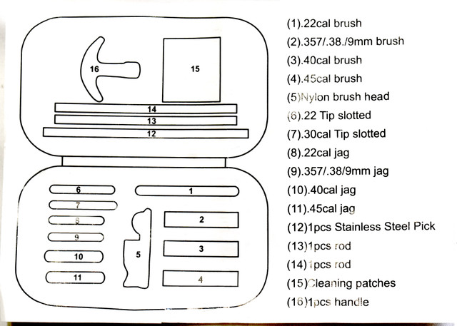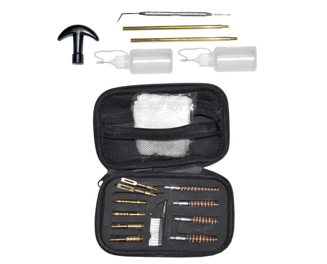 Cleaning kit for .22/.357/.38/9mm/.45 Caliber Pistol, Bronze Bore Brush and Brass Jag Adapter. Soft case included.