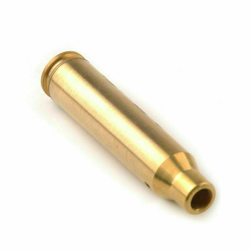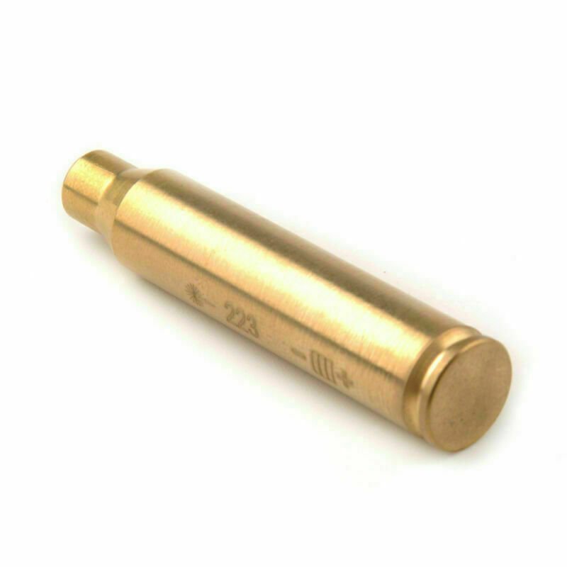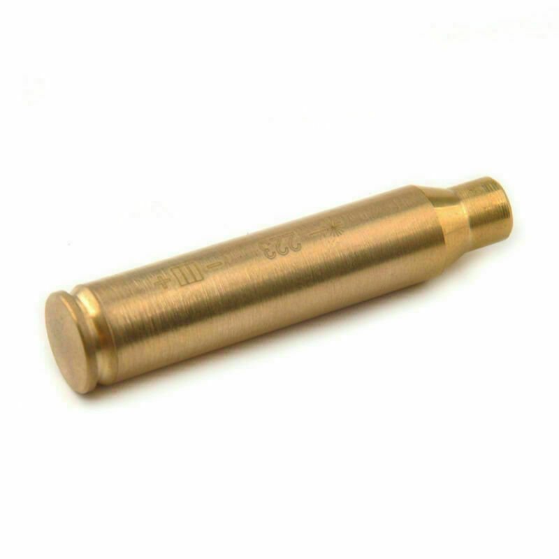 This .223 / 5.56 Rem chamber-style red laser bore sighter is a compact, self-contained solution for zeroing and sight alignment without firing live rounds. The unit’s machined brass housing resembles a cartridge but contains a precision laser module and the battery compartment. When inserted into the chamber and the action gently closed, the laser projects a red dot aligned with the bore axis so you can adjust windage and elevation on your scope or sight to match point-of-aim — fast and ammo-free.