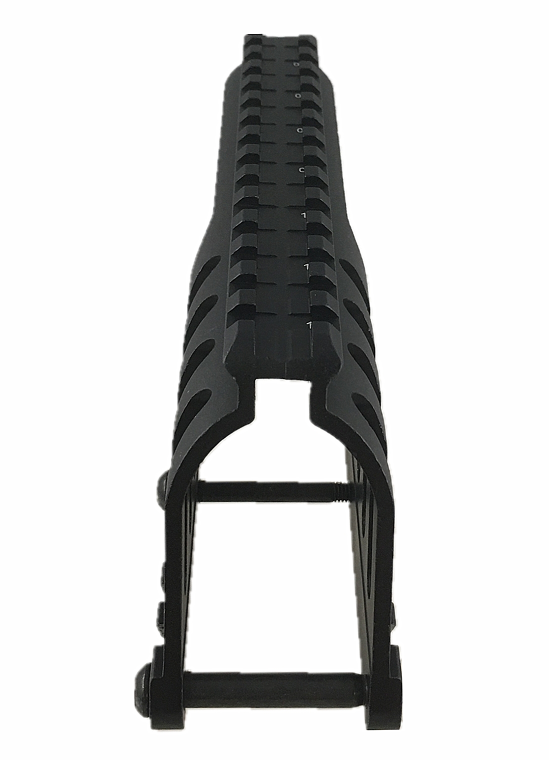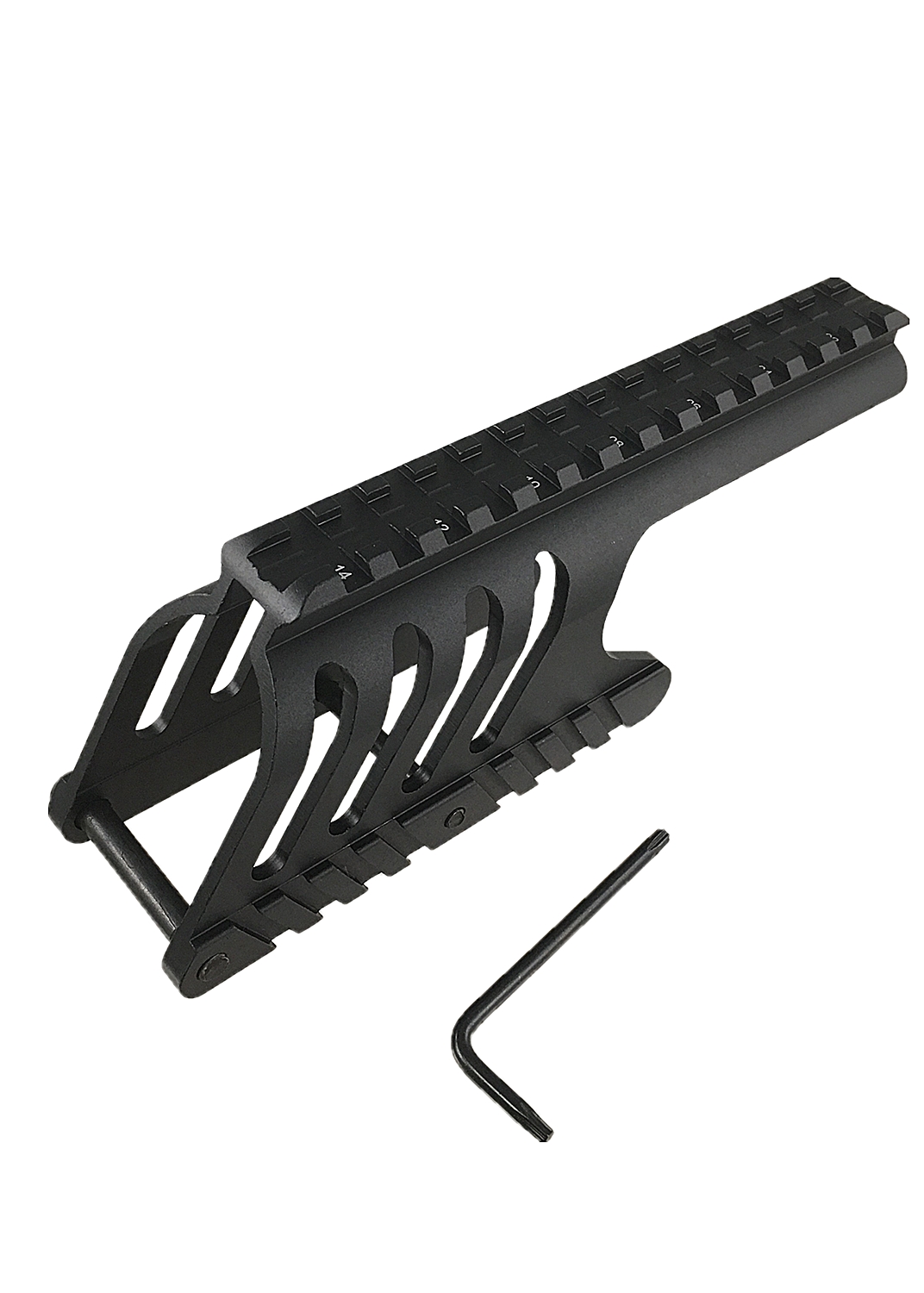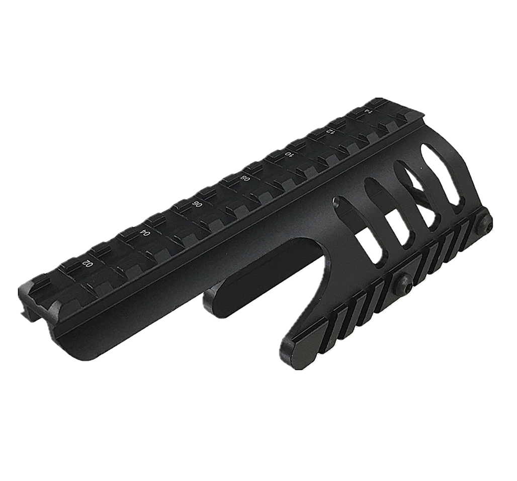 Provides a 7/8″ top rail with 14 slots, compatible with Weaver / Picatinny accessories